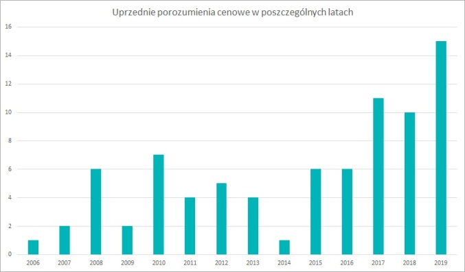 Dostępne dane pokazują, że od 2006 r. do końca 2019 r. złożono 376 wniosków o zawarcie uprzednich porozumień cenowych: 328 dotyczyło porozumień jednostronnych, 44 dwustronnych i 4 z nich wielostronnych. Liczba składanych wniosków nie wzrastała jednak systematycznie z roku na rok. W pierwszym roku obowiązywania przepisów wpłynęło ich 12, a w późniejszych latach liczba ta utrzymywała się na poziomie kilku – kilkunastu rocznie. Jednak w 2018 r. złożono już 98 wniosków, co oznacza kilkukrotny wzrost popularności tej instytucji. Spośród złożonych wniosków, 89 dotyczyło zawarcia porozumienia jednostronnego, 8 – dwustronnego, natomiast 1 - wielostronnego. W roku tym odbyło się również 70 spotkań wstępnych mających na celu doprecyzowanie zagadnień, które miały zostać objęte porozumieniem. Poniższy wykres pokazuje, jak przedstawiała się ilość złożonych wniosków w poszczególnych latach.