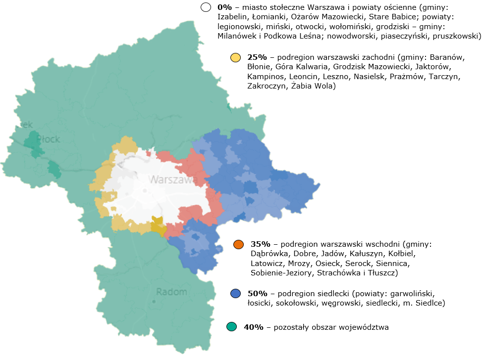3. 50% – podregion siedlecki (powiaty: garwoliński, łosicki, sokołowski, węgrowski, siedlecki, m. Siedlce).