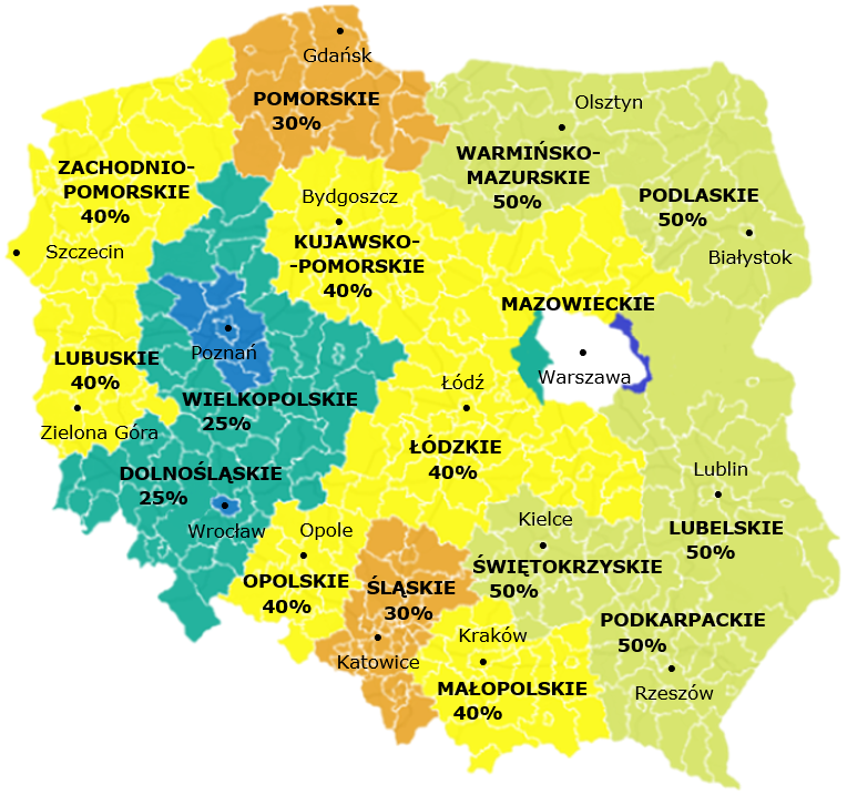 2. 40% wydatków inwestycyjnych – w woj. zachodniopomorskim, lubuskim, kujawsko-pomorskim, mazowieckim regionalnym (z wyjątkiem regionu warszawskiego stołecznego oraz podregionu siedleckiego), łódzkim, opolskim oraz małopolskim;