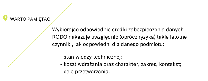 Oznacza to, że administrator lub podmiot przetwarzający powinien dobrać zabezpieczenia samodzielnie, uwzględniając potrzeby oraz możliwości danego podmiotu.
